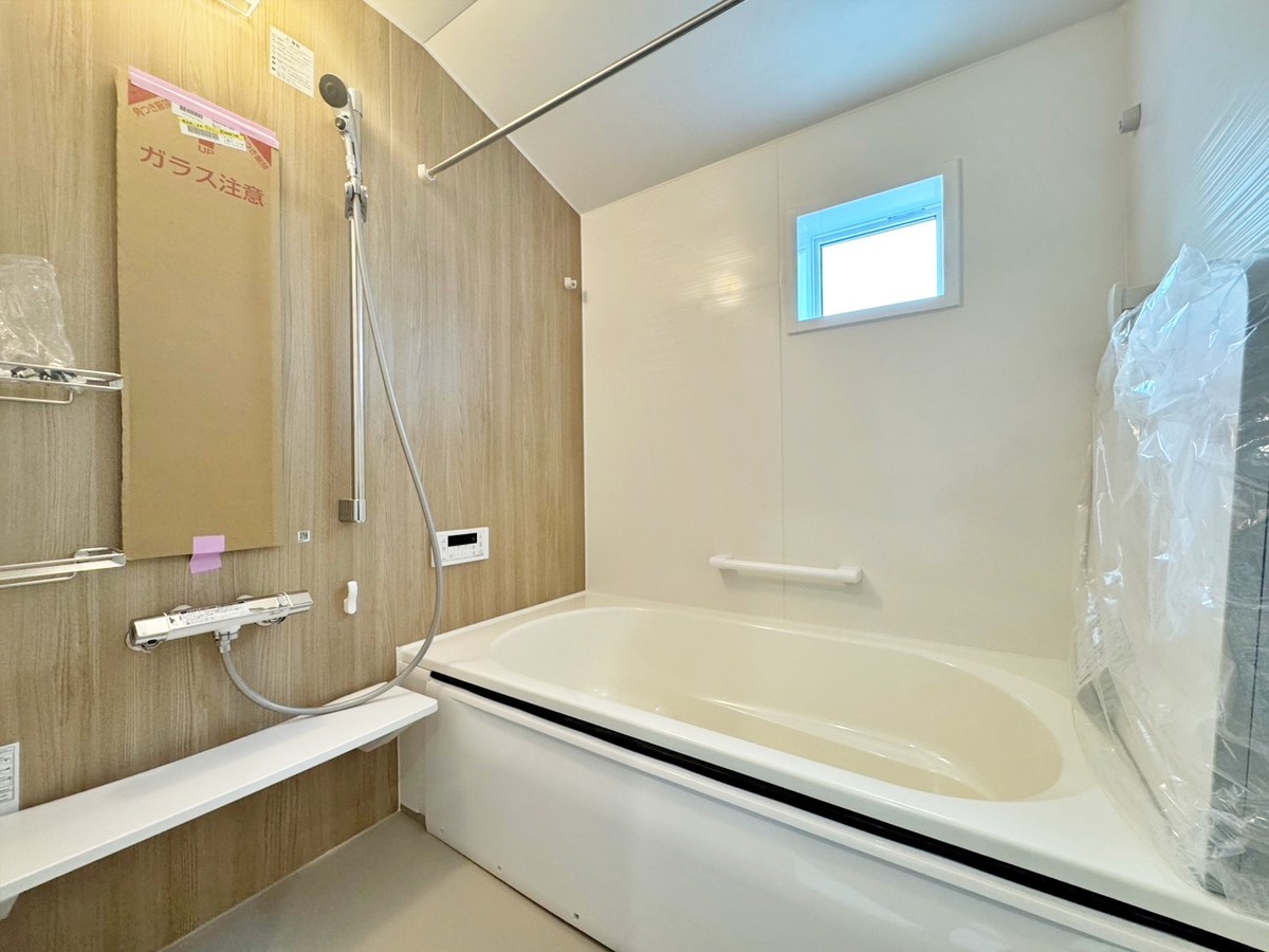 温かみのある木目調の壁と、清潔感あふれる白のコントラストが心地よい空間。採光窓からの自然な光が、一日を癒すバスタイムを優しく彩ります