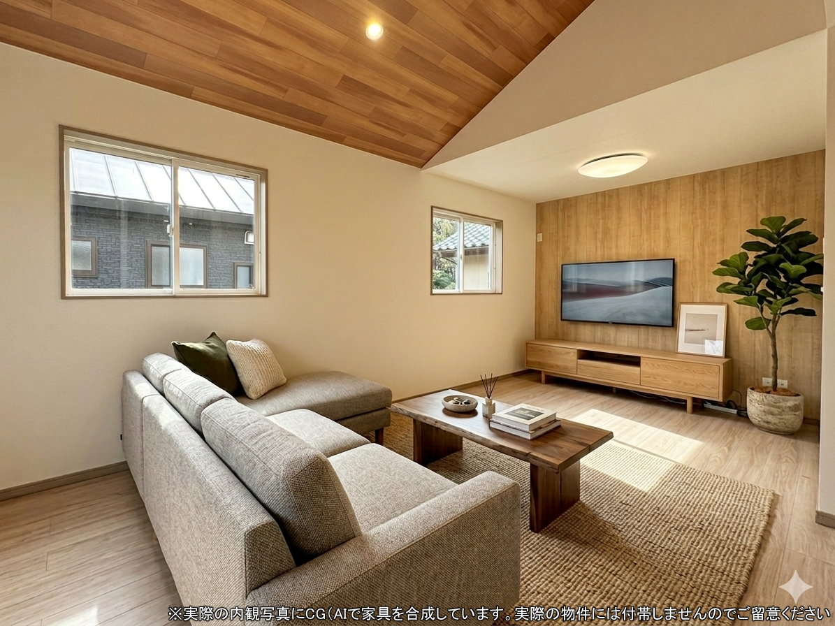 2階リビングの陽当たり良好なリビング。木目調の勾配天井で高級感と開放感があり、広く感じることが出来ます。