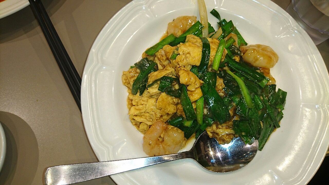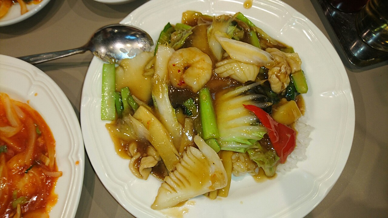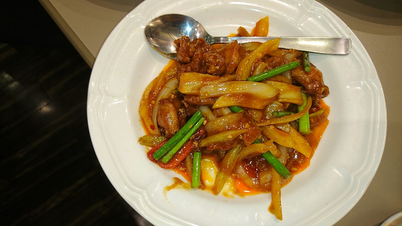 五目あんかけと豚肉とニラの焦がし醤油炒めが来て、案の定2人席のテーブルでは足りず